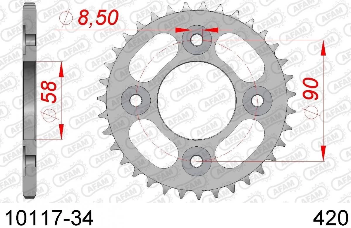 Een stalen 34 tands AFAM achtertandwiel. De tandwielen van AFAM zijn gemaakt van C45 staal met inductie geharde tanden, het tandprofiel is concentrisch, plat en perfect rond. Door deze samenstelling zijn de AFAM tandwielen perfect ter vervanging of zelfs ter verbetering van de OEM tandwielen.